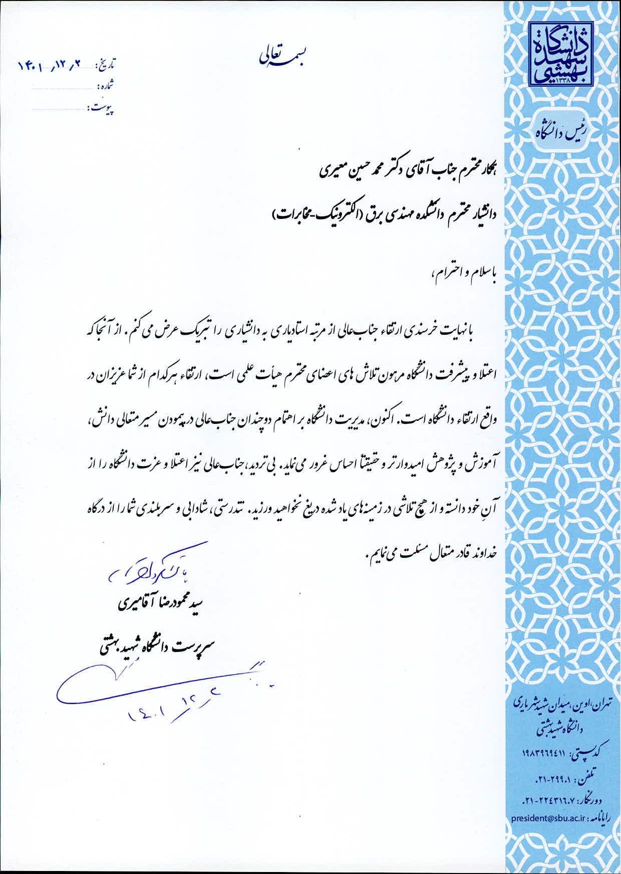دکتر سید محمود آقامیری، رئیس دانشگاه شهید بهشتی، با ارسال پیامی ارتقاء مرتبه علمی دکتر محمد حسین معیری ، عضو هیات علمی دانشکده مهندسی برق-الکترونیک و مخابرات را از مرتبه استادیاری به دانشیاری تبریک گفت. متن پیام به شرح زیر است: