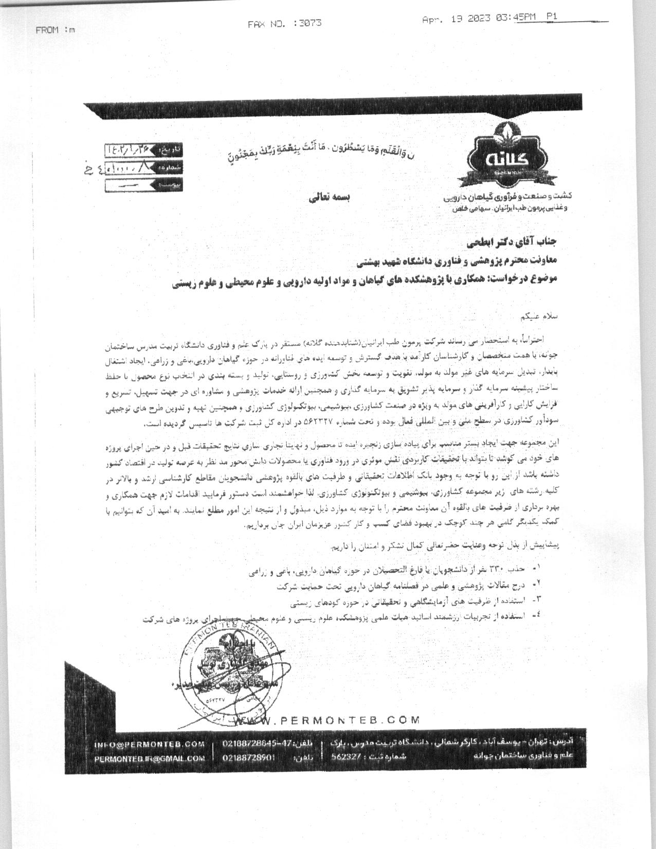 پذیرش پروژه و دانشجو در شرکت کشت و صنعت و فرآوری گیاهان دارویی و غذایی پرمون طب ایرانیان