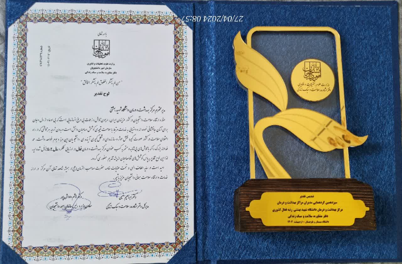 اداره بهداشت و درمان معاونت دانشجویی دانشگاه شهید بهشتی در سومین گردهمایی مشترک مدیران مراکز بهداشت و درمان و مشاوره و سبک زندگی دانشگاه های سراسر کشور وزارت علوم در دانشگاه سیستان و بلوچستان در تاریخ ۵ تا ۷ ام اردیبهشت ماه سال ۱۴۰۳ به عنوان کسب عنوان مرکز بهداشت و درمان فعال کشوری در سال ۱۴۰۲ برگزیده شد و موفق به دریافت تقدیرنامه از سوی معاون محترم وزیر و رئیس سازمان اموردانشجویان و مدیرکل محترم دفتر مشاوره ، سلامت و سبک زندگی گردید.