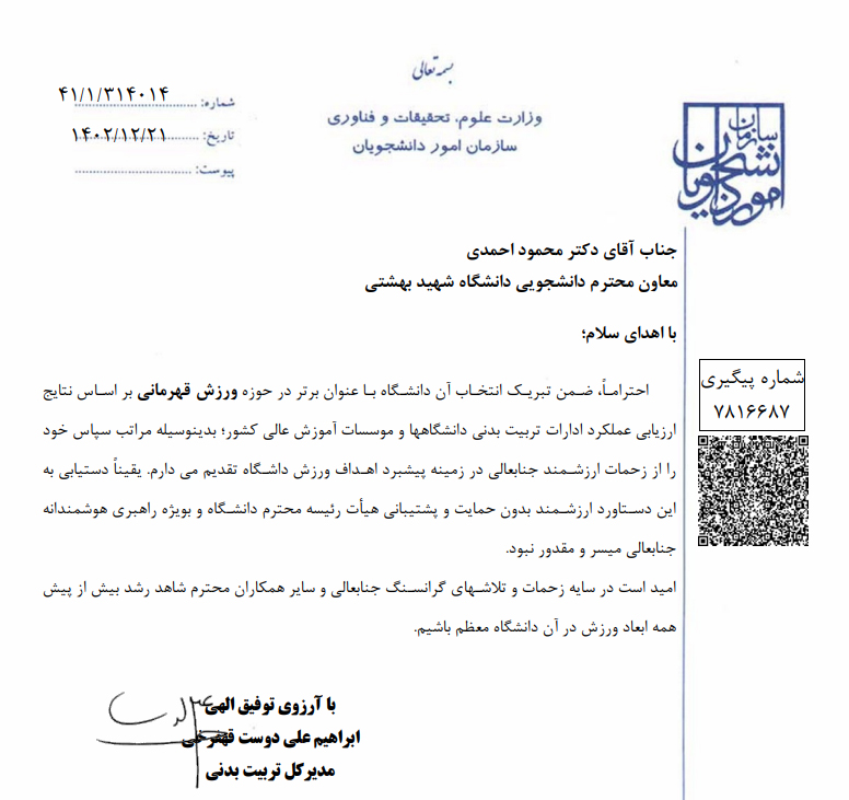 انتخاب دانشگاه شهید بهشتی به عنوان دانشگاه برتر در حوزه ورزش قهرمانی
